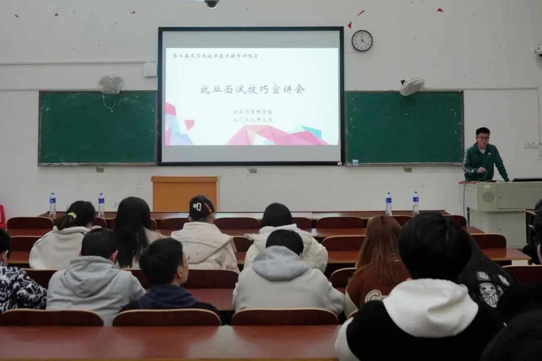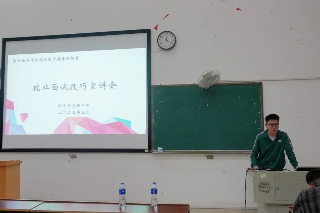 为贯彻落实习近平总书记关于做好高校毕业生就业工作的重要指示批示精神,坚决落实党中央、国务院“稳就业”“保就业”决策部署,促进毕业生更加充分更高质量就业,永利皇宫官方网站于3月20日中午13;00在外语楼北301教室组织召开永利皇宫官方网站第七届大学生就业能力提升训练营就业面试技巧宣讲会。永利皇宫官方网站党总支副书记周思敏和辅导员肖策予莅临本次会议,此次会议由肖老师主持。