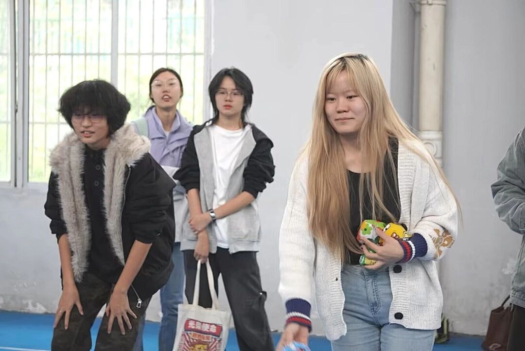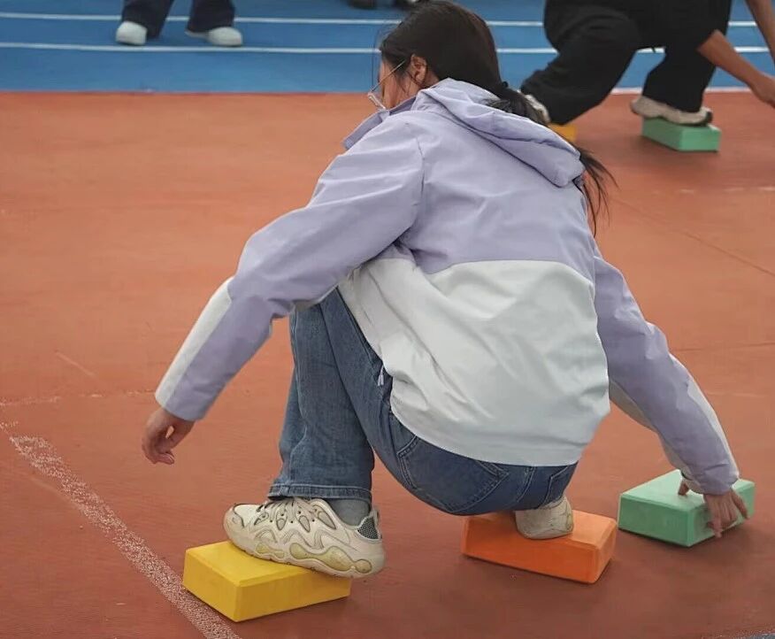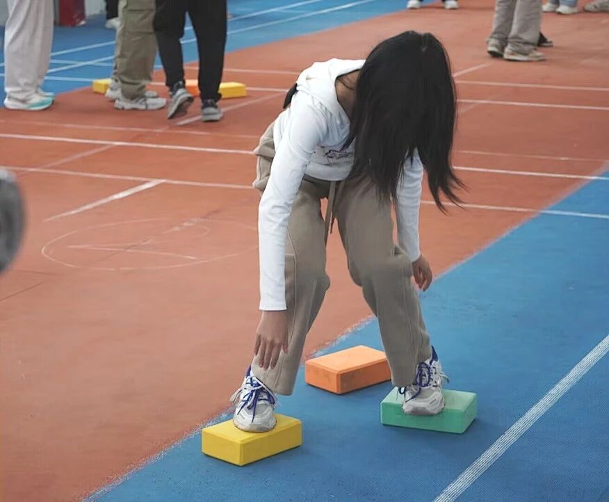 4人小队踩着瑜伽砖前进,既要保持平衡,又要注重速度。有队员失去平衡后立即起身继续,赢得观众的掌声。