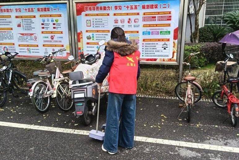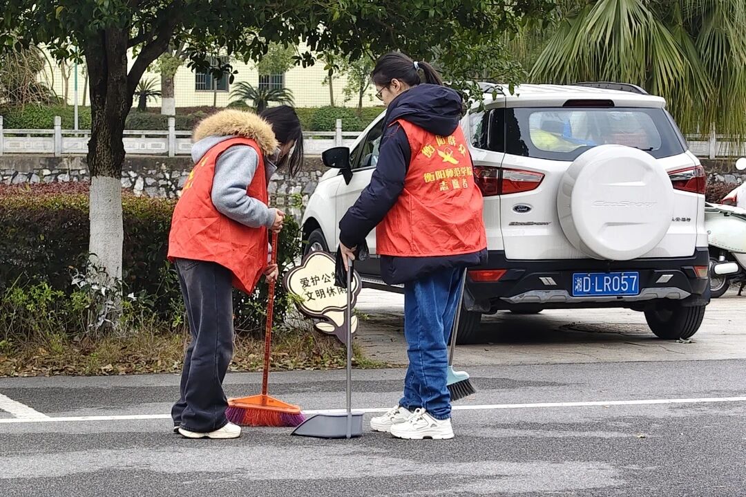 活动伊始,志愿者们分工协作,利用扫把、簸箕等工具,对校园主干道及林荫小径、花坛周边的各角落进行细致清扫,将电动车、自行车逐一挪移至指定停车区域,并摆放整齐,引导车辆有序停放。清理干净散落的塑料袋、枯叶及杂物后,整个广场整洁如新,美观得体,令人赏心悦目。