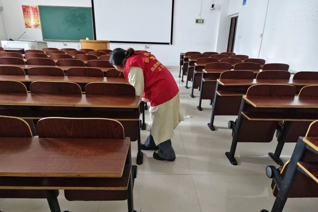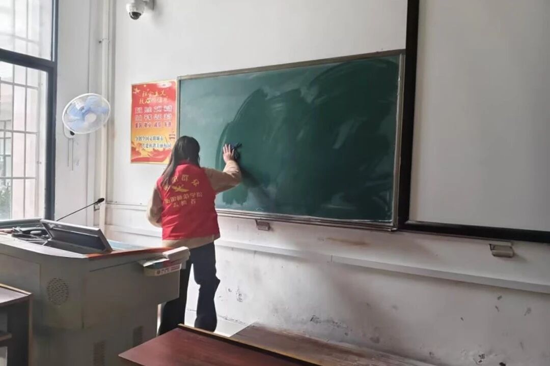 在日日学习的教室里,志愿者们同心协力,认真细致地清理打扫每个角落,针对死角堆积的粉尘、落灰的黑板和零散垃圾多次检查清理,并摆放好讲台工具。活动结束后,教室更加规整明亮,学习环境更加令人愉悦舒心。