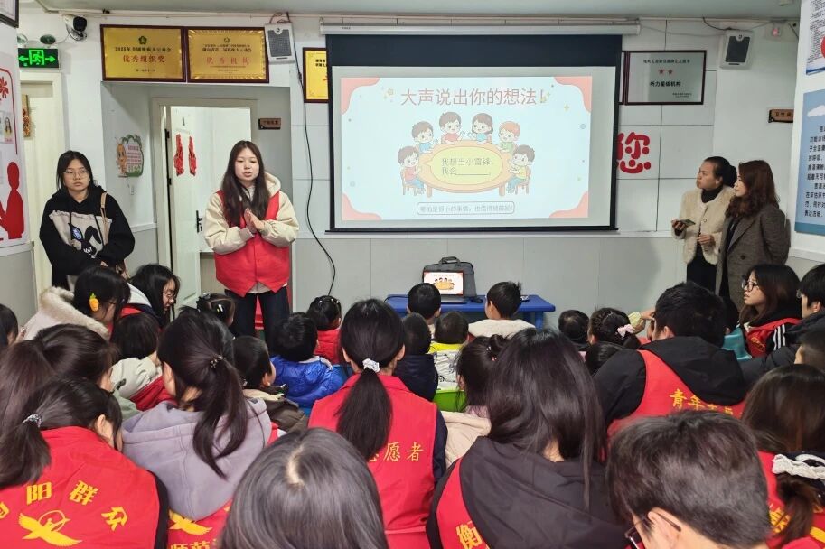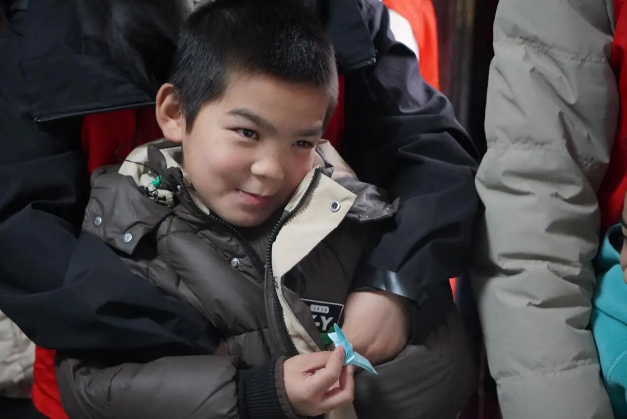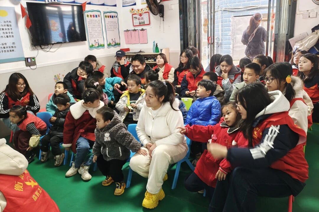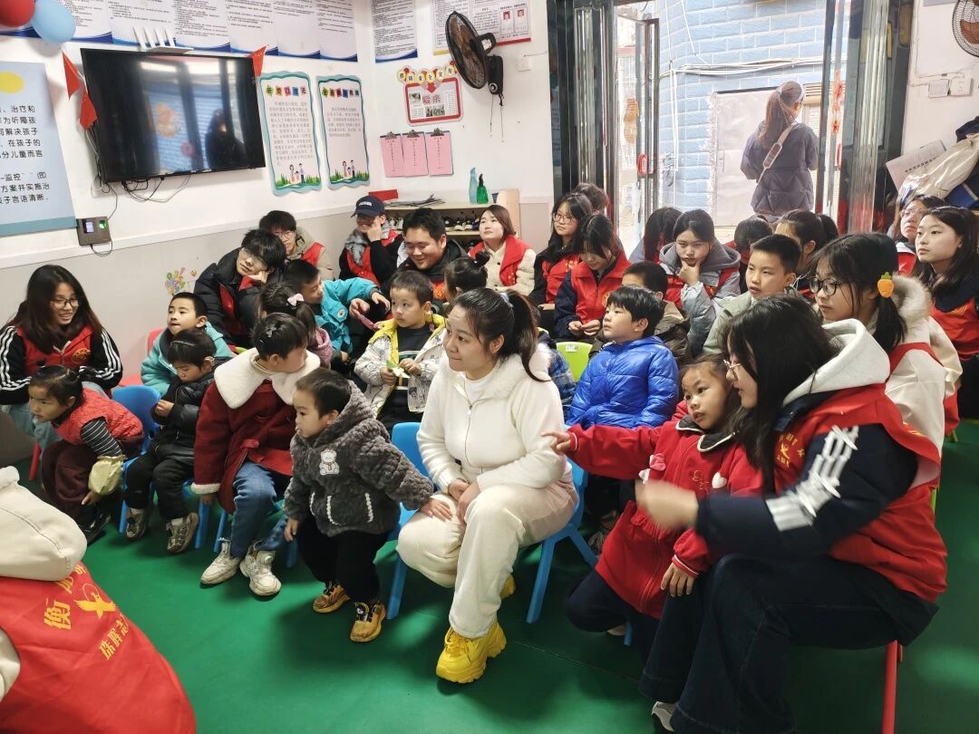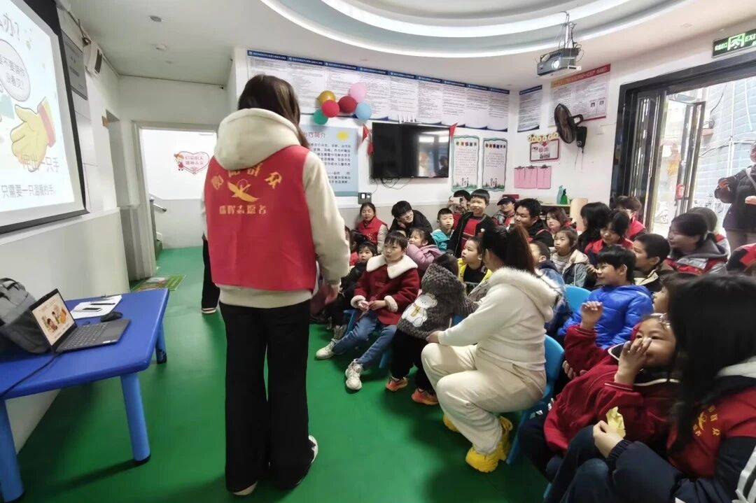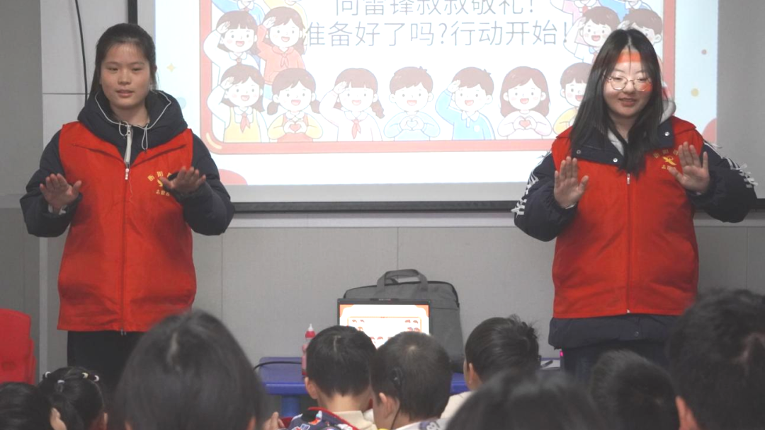 孩子们跟着节奏挥动小手,动作虽显生涩,却透着认真与快乐。指尖舞动间,温情无声流淌,孩子们的参与感、表现力与沟通能力在律动中悄然提升。志愿者们带领孩子们学习与雷锋精神、节约、友爱相关的手势舞。