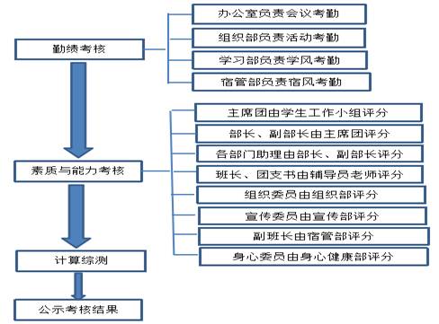 1.由组织部和办公室负责学生干部的值班考勤和签到考勤;由学习部、宿管部负责学生干部的学风、宿风考勤;宿管部、学习部、组织部、宣传部、身心健康部、主席团、辅导员和两位书记负责班委的素质与能力考核;各部门部长及副部长、主席团、辅导员和两位书记负责各部门成员的素质与能力考核;组织部负责将考核情况汇总,根据考核细则和评分细则计算出每位学生干部的最终得分,完成初步考核(分团委学生分会学生干部考核汇总表见附件十一)。