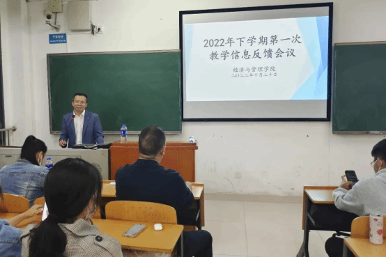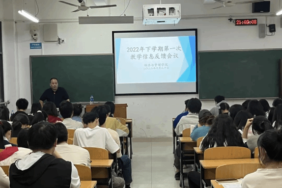 为了解学生在课程教授和学风学情方面的问题,永利皇宫官方网站于10月20日晚上19:30在理科楼南108教室召开了2022年下学期第一次教学信息反馈会议。学院副院长陈忠文、党总支副书记周思敏、教务秘书雷雪丽老师、周楠老师、学生分会学习部部长张沙、副部长陈香君以及2020-2022级各班级班长和学习委员参加了此次会议。