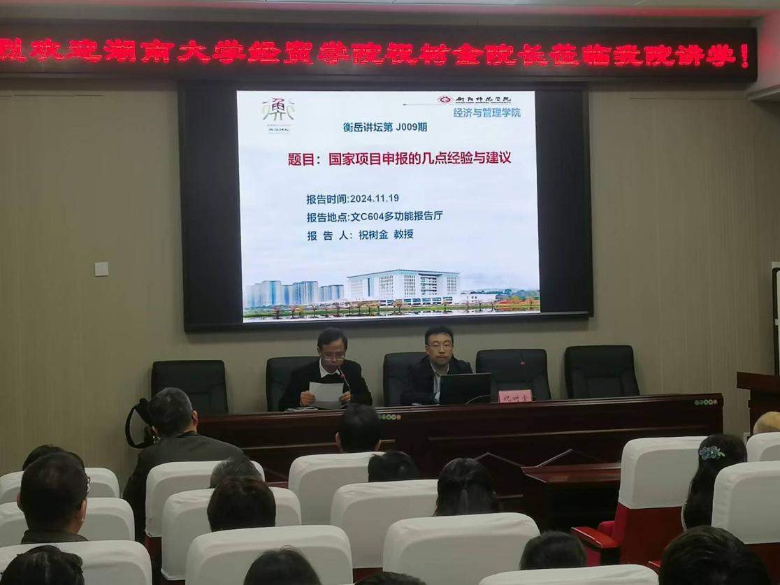 11月19日下午,湖南大学经济与贸易学院院长、博士生导师祝树金教授以“国家项目申报的几点经验与建议”为题,在文C604多功能报告厅开展学术讲座,讲座由肖黎院长主持,全体专任教师及研究生参与本次学术活动。