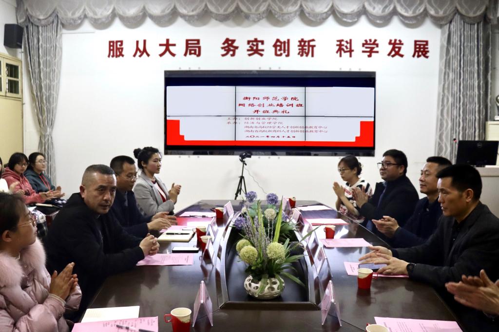 2021年4月15日,由永利皇宫官方网站团委主办,永利皇宫官方网站、湖南省高校经管类人才创新创业教育中心和高校新商科人才创新创业教育中心承办的网络创业培训班开班典礼在文综楼C栋五楼会议室成功举行。衡阳市就业服务中心主任曹云、副主任彭建嘉、培训科科长罗美、永利皇宫官方网站创新创业学院副院长魏文生、永利皇宫官方网站党总支书记廖新平、副书记黄懿、副院长陈忠文、授课教师冯君莹、培训班班主任龙偲以及全体学员参加了本次开班典礼。开班典礼由廖新平书记主持。