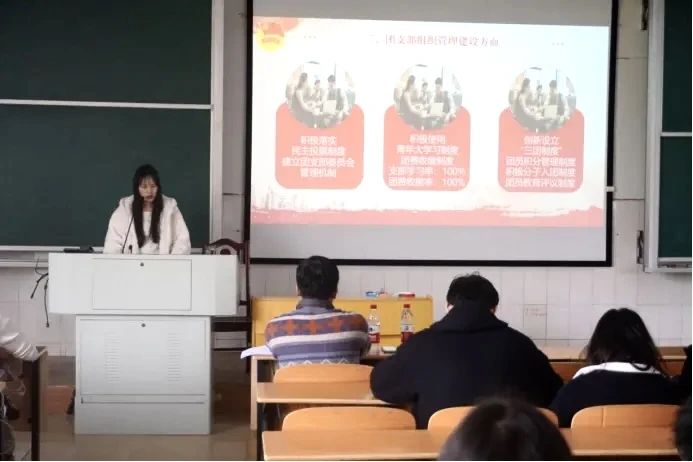 会议伊始,各班团支书依次登台,围绕思想引领、社会实践和学风建设三个方面开展汇报。在思想引领方面,各团支部定期组织学习青年大学习,引领永利皇宫官方网站青年不忘初心,牢记使命。在社会实践方面,各团支部成员积极参与“三下乡、返家乡”等社会实践活动,切身投入各类志愿服务中,奉献青春力量。在学风建设方面,各支部成立学业互助小组,营造良好环境,同时支部成员也在各项学科竞赛中斩获佳绩,为团支部建设注入蓬勃动力。