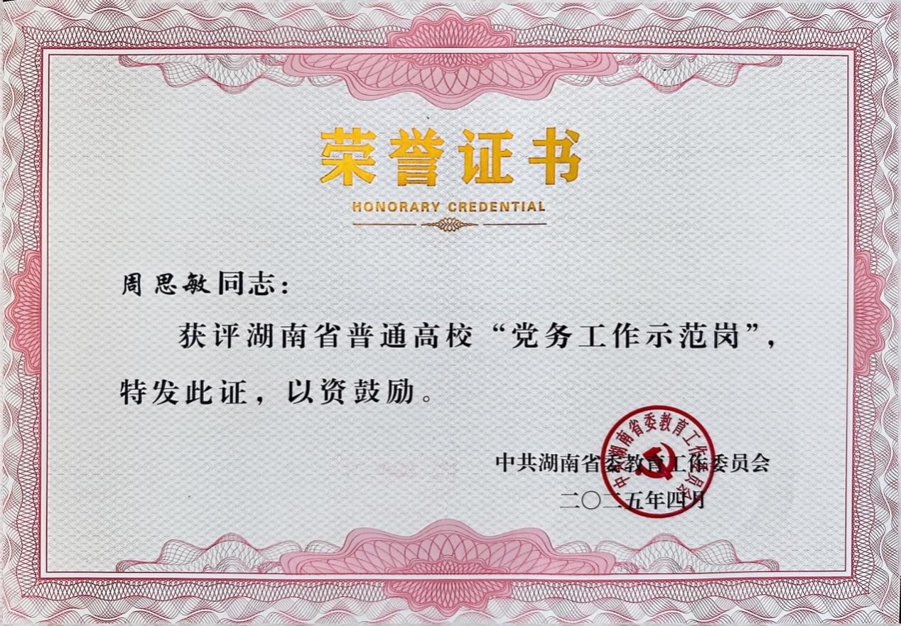 近日,湖南省委教育工委印发了《关于公布全省高校党组织 “对标争先” 建设计划第四批项目评选结果的通知》(湘教工委通〔2025〕13 号),永利皇宫官方网站党总支副书记周思敏同志荣获全省高校 “党务工作示范岗”。这是继2024年永利皇宫官方网站党总支荣获湖南省教育系统先进基层党组织之后,再次荣获的省级党建工作荣誉。