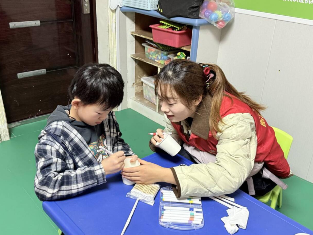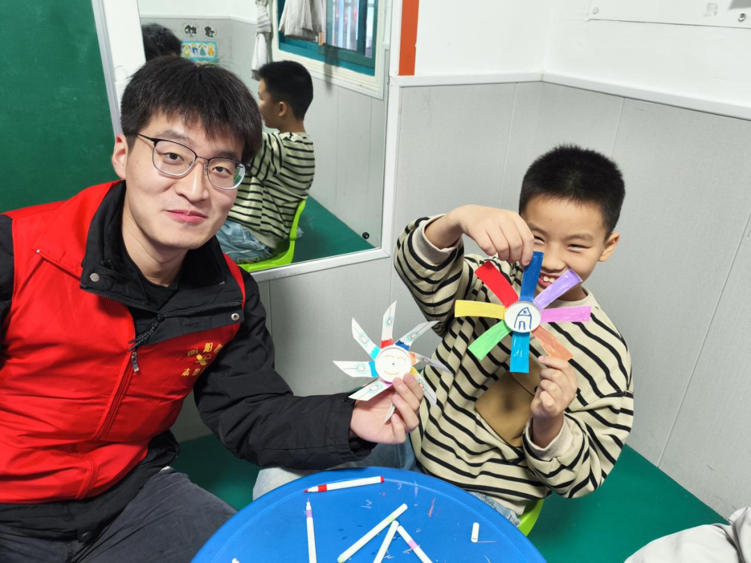 活动伊始,学生党员们充分发挥先锋模范作用,以高度的政治责任感和服务意识投入志愿服务。他们提前统筹教学物资,通过表情互动、手势交流等方式,迅速拉近与孩子们的距离。在“纸杯风车共制”环节中,全体党员自始至终俯身相伴,以手把手、慢节奏的方式示范讲解折叠、固定、装饰等每一个步骤。他们既是统筹秩序的“组织者”,也是结对陪伴的“暖心伙伴”,细致地关怀让听障儿童感受到社会大家庭的温度,也展现出基层党组织强大的凝聚力和战斗力。