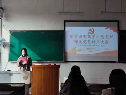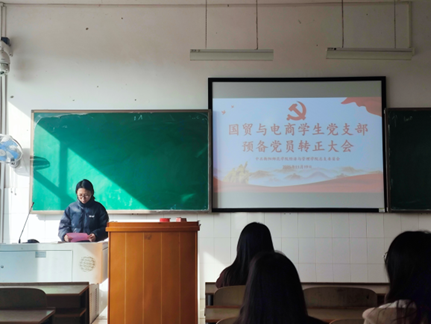 国贸与电商学生党支部书记张瑶宣布大会决议并作总结发言。国贸与电商学生党支部书记张瑶指出,张嘉嘉、曹王琦、雷丽3名预备党员在为期一年的考察期内,始终以共产党员标准严格要求自己,在思想、学习、工作等方面均表现优异,充分发挥了先锋模范作用,已达到正式党员转正标准。经支部大会无记名投票表决,一致同意上述3名同志按期转为正式党员。