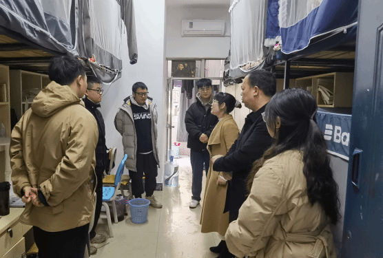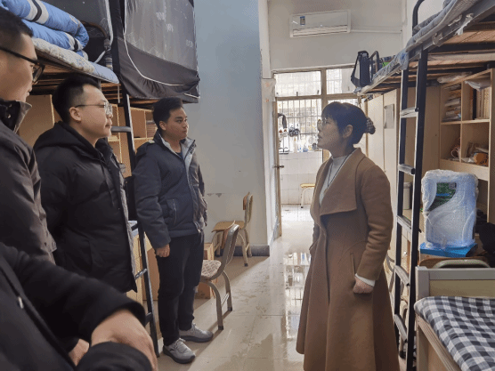为创建平安校园,深入了解永利皇宫官方网站研究生的学习生活情况,永利皇宫官方网站党总支书记凌飞飞、党总支副书记周思敏、研究生辅导员黄智慧于1月4日上午深入6栋研究生宿舍走访。