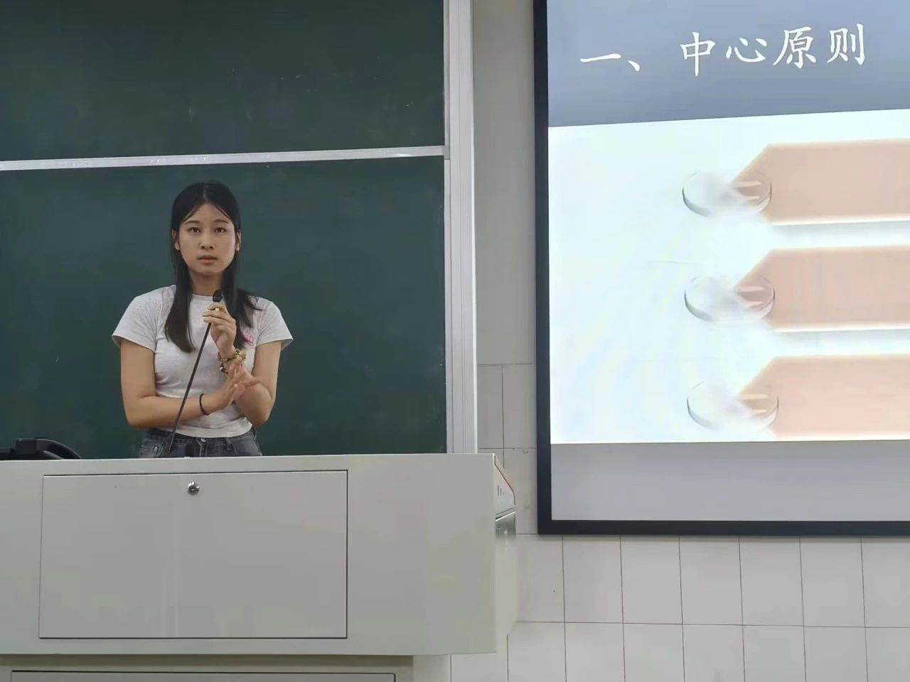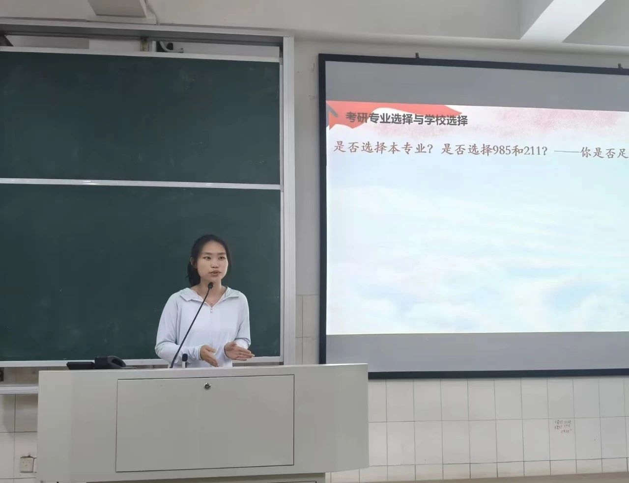 随后,三位考研考公上岸的同学分别进行了经验分享。骆丽庄同学从微观的角度出发,结合自身考研历程,详尽探讨了择校的重要性,并针对考研各科目整理了具体的备考方法和思路。在分享最后,她为学弟学妹们送上了美好祝愿和深情寄语,望大家保持“自信、自律、自我、自立、坚持”的心态,勇毅前行,顺利抵达成功彼岸。