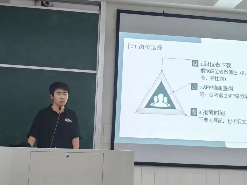 王广安同学分别从选岗的重要性、资料获取的途径,以及笔试前中后期复习方案三方面进行了考公经验分享,并着重讲解了申论和行测考试的复习步骤和答题技巧,现场考公同学纷纷表示深受启发。