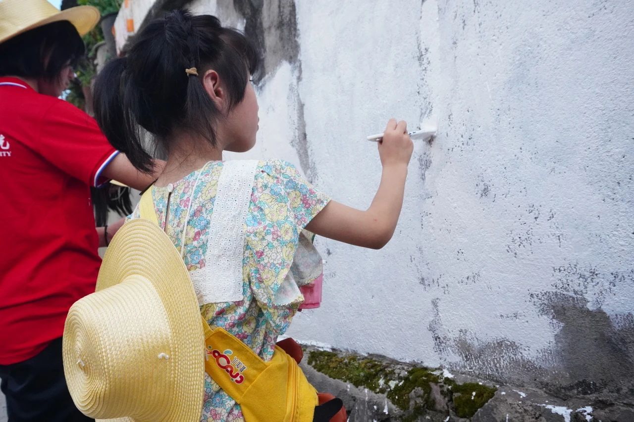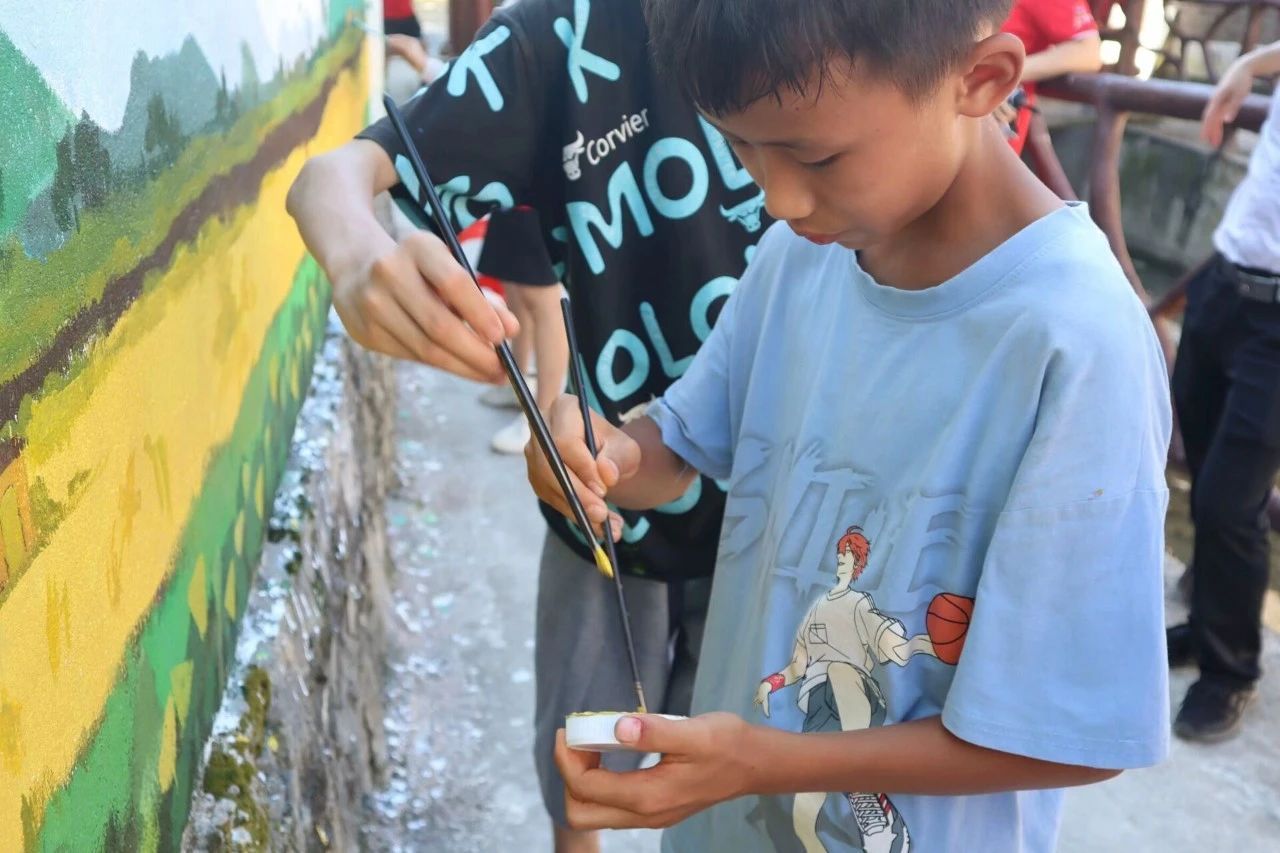 通过访谈调研了解当地需求与乡土特色,志愿者们结合柳林稻花鱼产业特色,将墙面装扮成独属于柳林的“宣传图册”。一笔一画,一墙一绘,过程中当地留守儿童也积极加入,与志愿者们携手绘制出一幅时和岁稔的画卷。