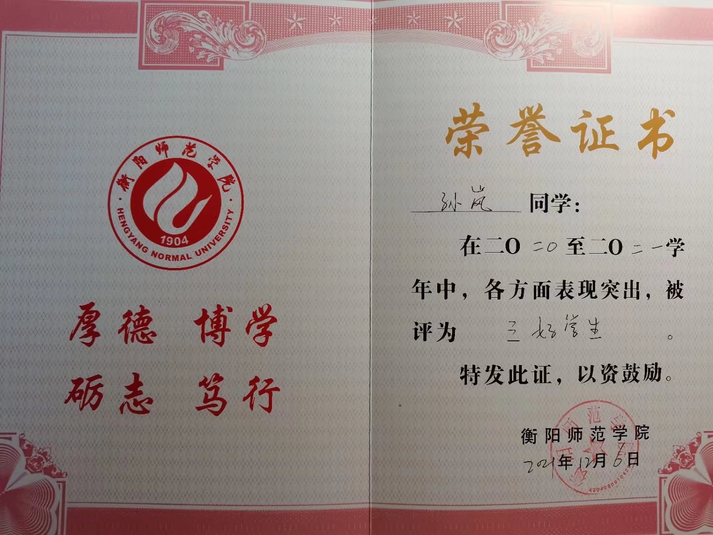 学习上,该生目标明确,态度端正。平日学习勤奋刻苦,善于总结学习经验,积极与老师和同学探讨题目,善于思考,同时与同学共同学习、互相进步。三年来,该生很好的平衡学习、工作、兴趣,充分利用时间学习并不断拓宽自己的知识面和视野,努力提升内在,学习成绩排名和综测排名一直稳居班级前三。通过不懈努力曾荣获2018-2019年度和2019-2020年度“三好学生”荣誉称号、2018年度校三等奖学金、永利皇宫官方网站月度学习之星等荣誉,并考取初中语文教师资格证、会计师助理从业资格证、国家计算机二级证书、英语四级证书、普通话二甲证书等专业证书。