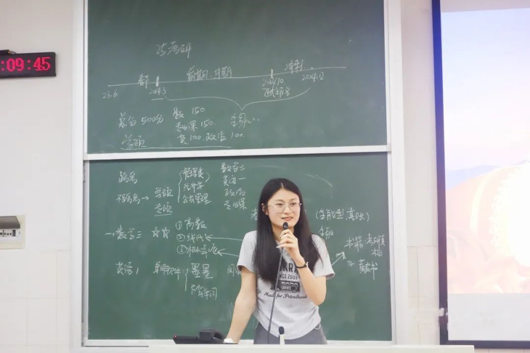 会议伊始,2019级财务管理三班彭盼盼(已被湘潭大学录取)就21级考研时间、具体考试内容以及自身考研经验三个方面展开讲述,重点介绍了考研的分类和推荐了各科老师,详细地展示了不同时间段的学习规划。
