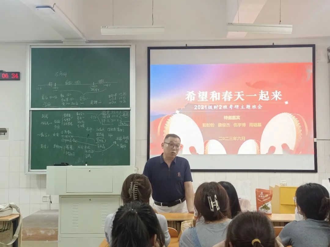 为进一步提高我班同学们对考研的认识,调动财二同学的考研积极性,提升同学们的考研竞争力,2021级财务管理二班于6月9日晚上19:30在文A308教室召开考研动员大会暨心得分享会。本次会议由班长黄艳丽担任主持人,班主任陈勇老师莅临此次会议,21级财务管理二班全体同学参加本次会议。